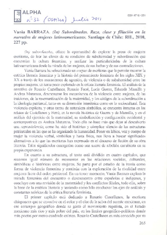 Autoras chilenas - Barraza, Vania - (In) subordinadas. Raza, clase y filiación en la narrativa de mujeres latinoamericanas