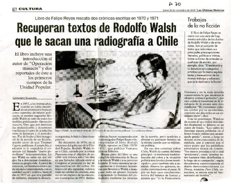 Recuperan textos de Rodolfo Walsh que le saca radiografía a Chile [artículo] Leonardo Sanhueza.