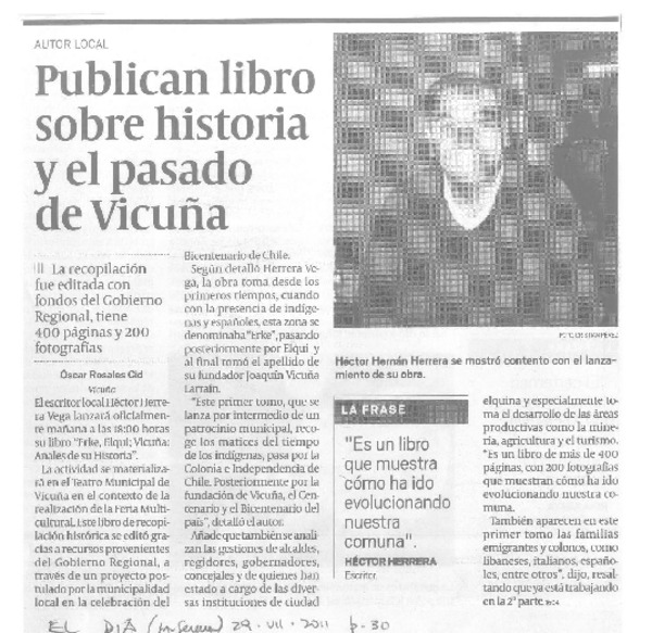 Publican libro sobre historia y el pasado de Vicuña [artículo] Óscar Rosales Cid.