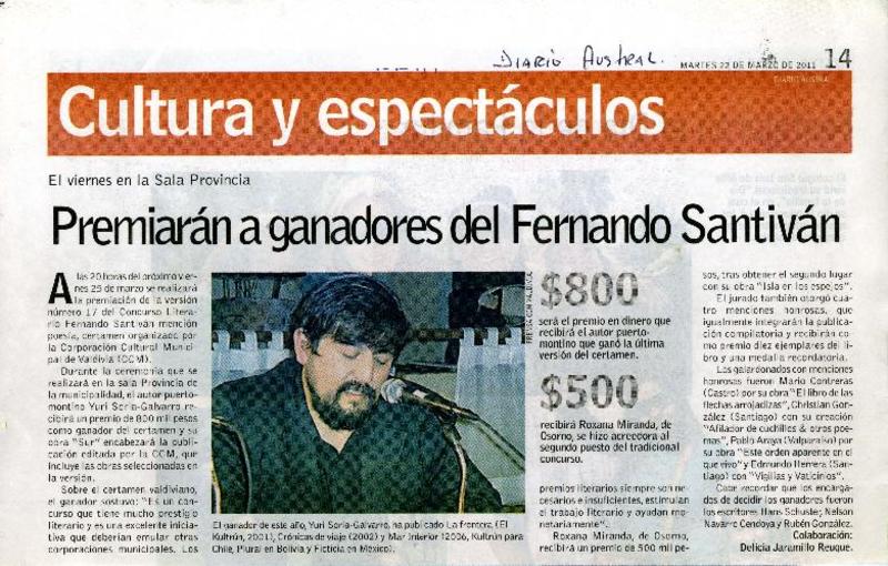 Premiarán a ganadores del Fernando Santiván [artículo] Delicia Jaramillo Reuque.