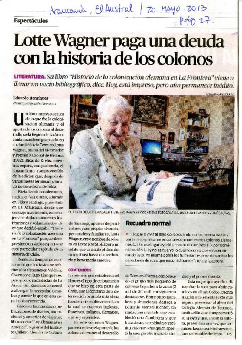 Lotte Wagner paga una deuda con la historia de los colonos [artículo] Eduardo Henríquez.
