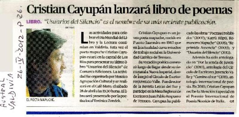 Cristian Cayupán lanzará libro de poemas. [artículo]