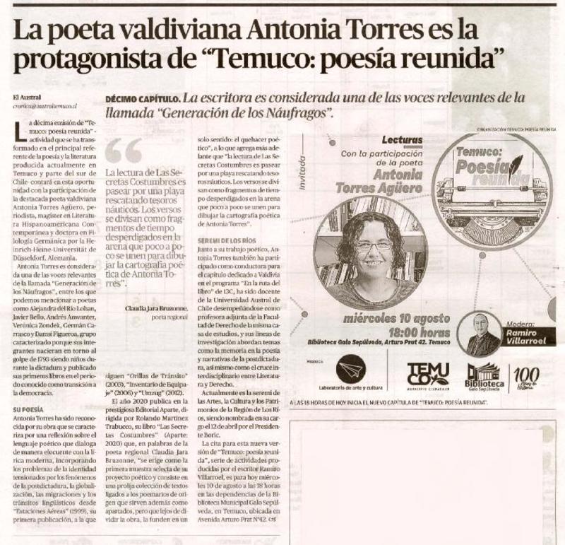 La poeta valdiviana Antonia Torres es la protagonista de "Temuco poesía reunida" [artículo] :