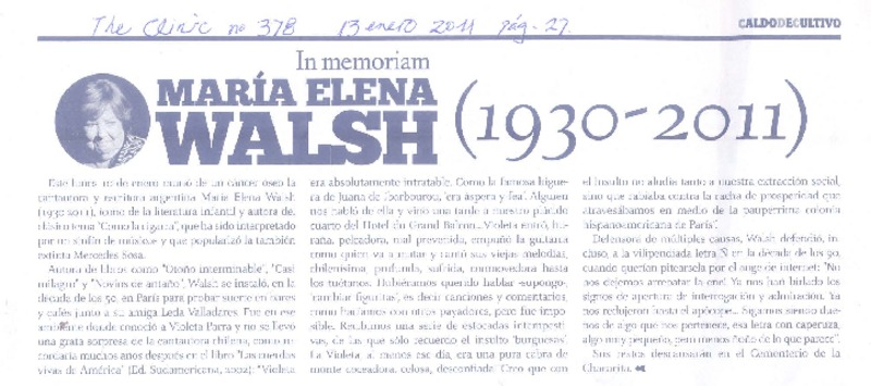 In memoriam María Elena Walsh (1930-2011) [artículo].