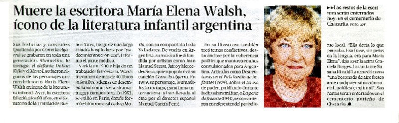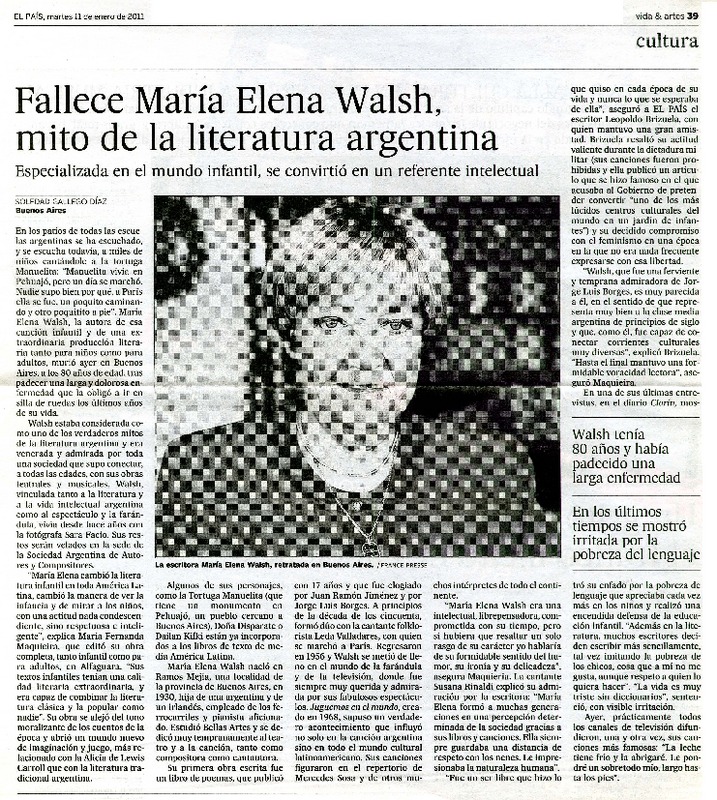 Fallece Marìa Elena Walsh, mito de la literatura argentina [artículo] Soledad Gallego Dìaz.