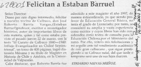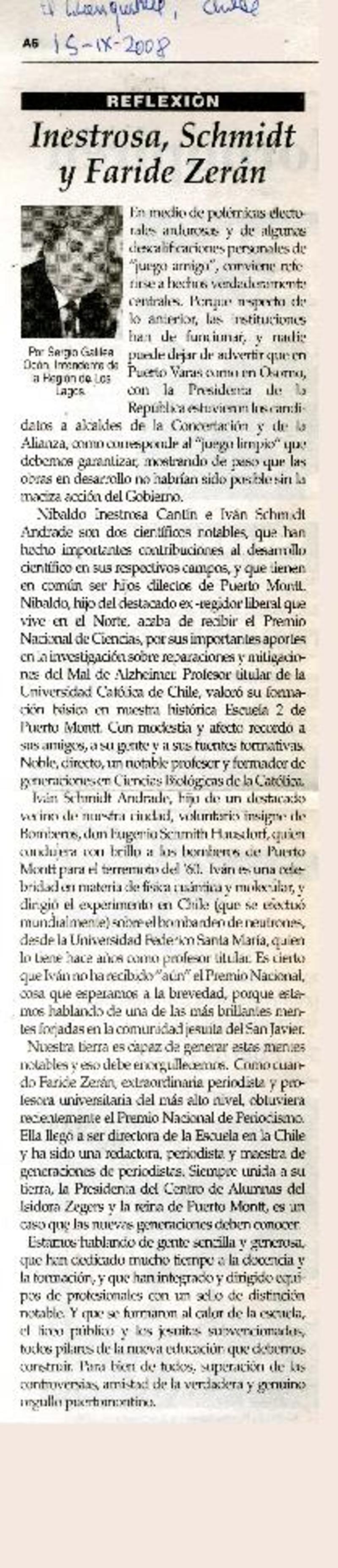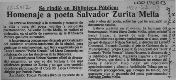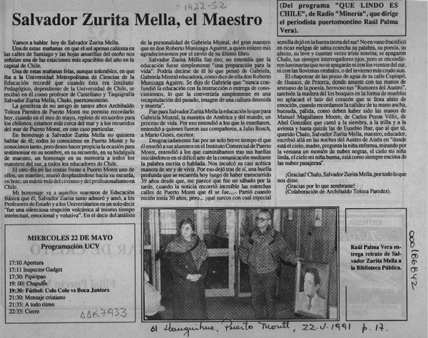 Agradece homenajes a Salvador Zurita M. [artículo] María Elena Zurita Mella.