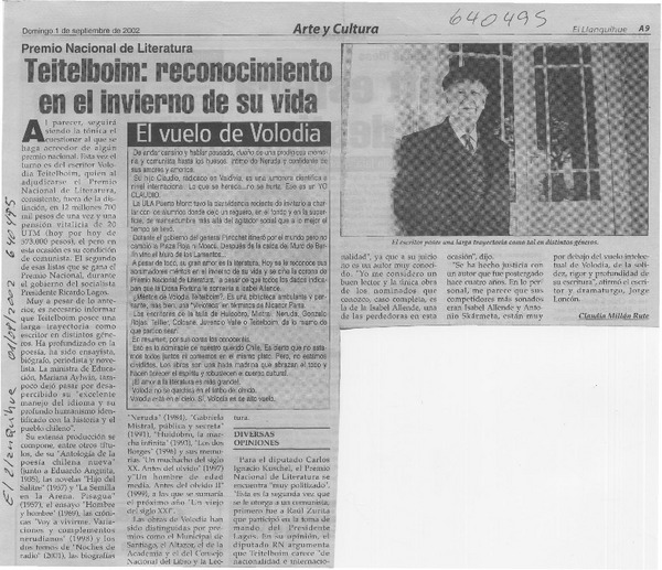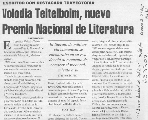 Volodia Teitelboim, nuevo Premio Nacional de Literatura [artículo]