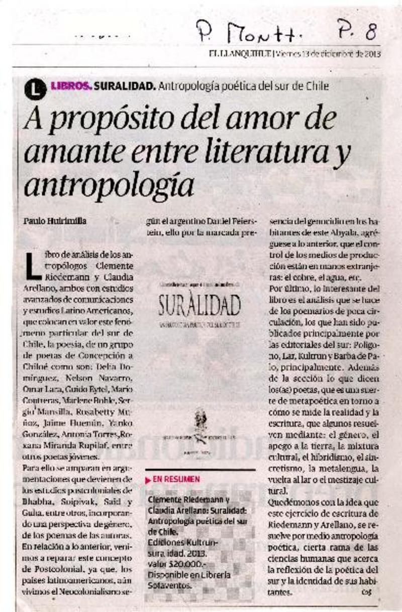 A propósito del amor de amante entre literatura y antropología [artículo] Paulo Huirimilla