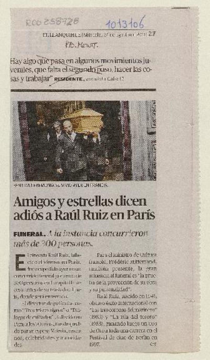 Amigos y estrellas dicen adiós a Raúl Ruiz en París [artículo]
