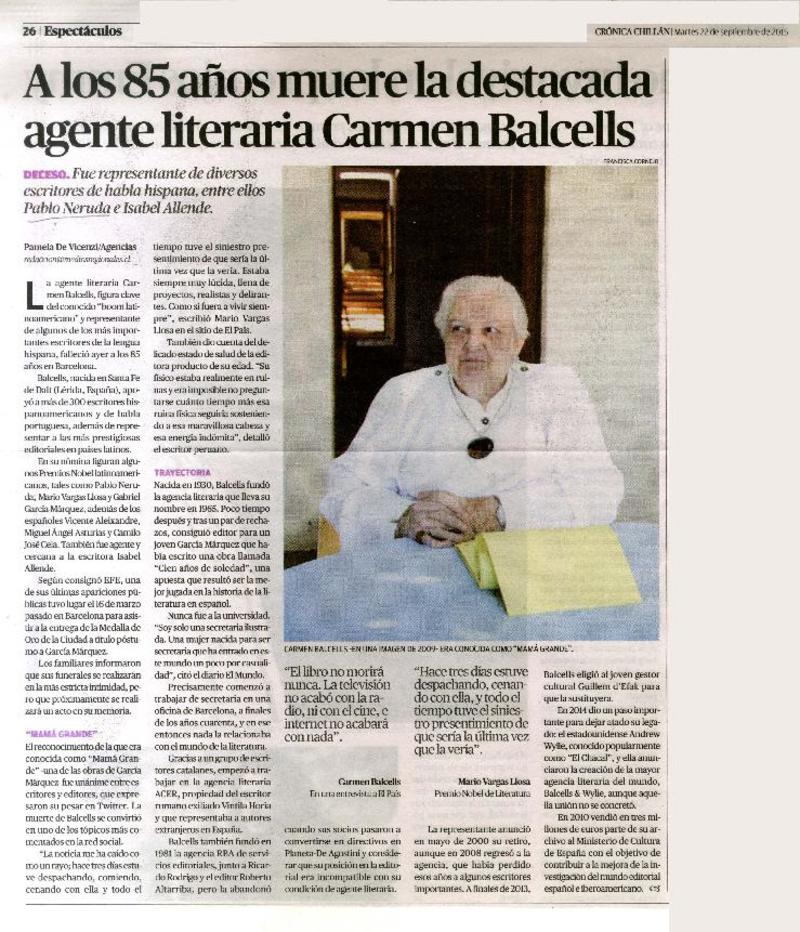 A los 85 años mueres la destacada agente literaria Carmen Balcells [artículo] Pamela De Vicenzi.