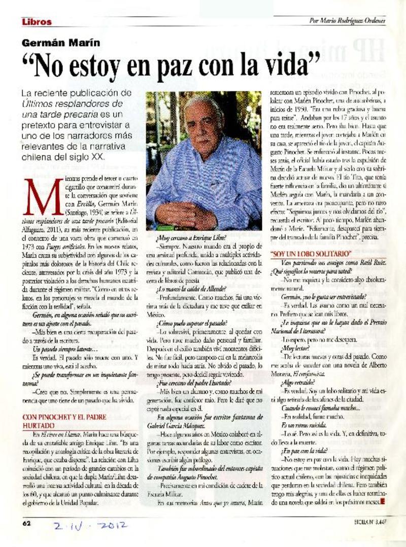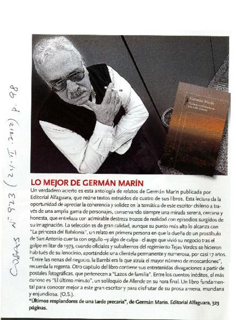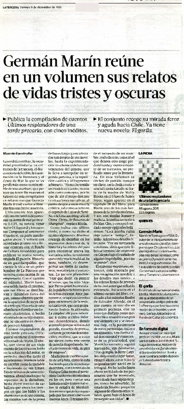 Germán Marín reúne en un volumen sus relatos de vidas tristes y oscuras [artículo] Marcela Fuentealba.