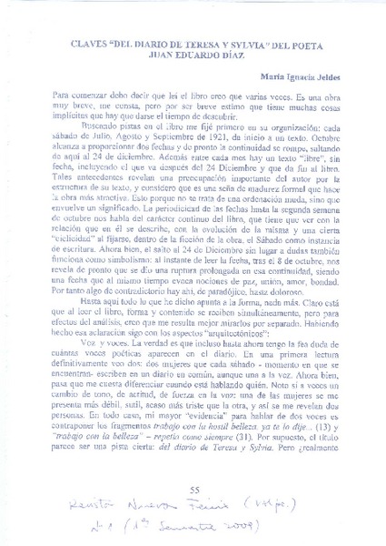 Claves "Del diario de Teresa y Sylvia" del poeta Juan Eduardo Díaz [artículo] María Ignacia Jeldes.