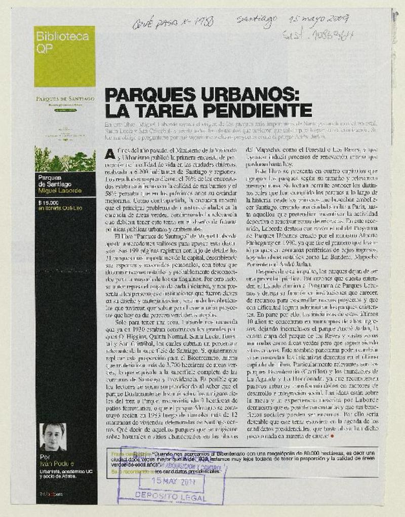 Parques urbanos: la tarea pendiente. [artículo] Iván Poduje.