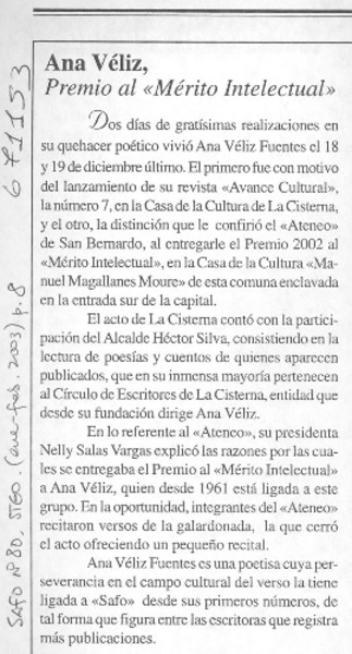 Ana Véliz, Premio al "Mérito intelectual". [artículo]