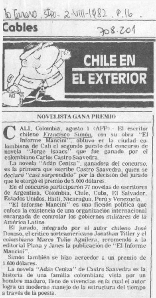 Chileno Simón con segundo premio literario colombiano. [artículo]