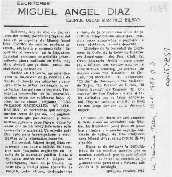 "Premios Nac. de literatura", libro de Miguel Angel Díaz A. [artículo] Pedro Mardones Barrientos.