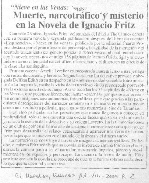 "Nieve en las venas": Muerte, narcotráfico y misterio en la novela de Ignacio Fritz [artículo]