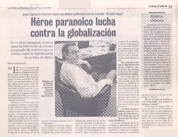 Juan Ignacio Correa hace su debut editorial con la novela "Al otro lado" héroe paranoico lucha contra la globalización [artículo] : Rodrigo Castillo R.