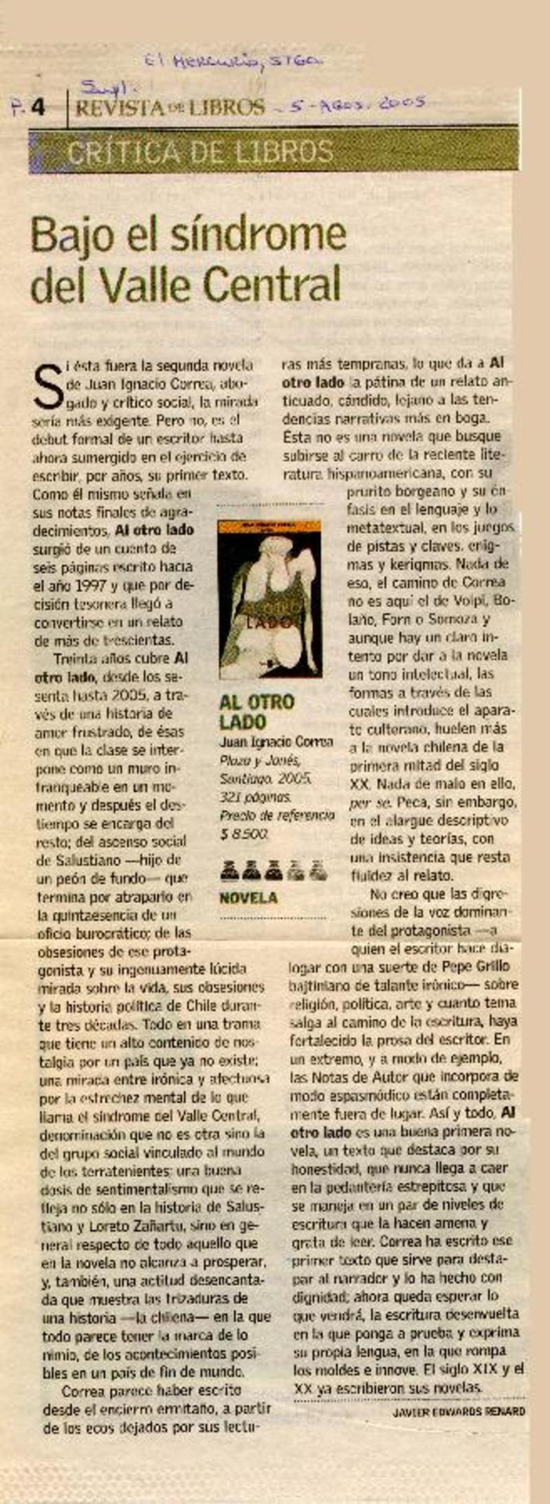 Bajo el síndrome del Valle Central [artículo]Javier Edwards Renard.
