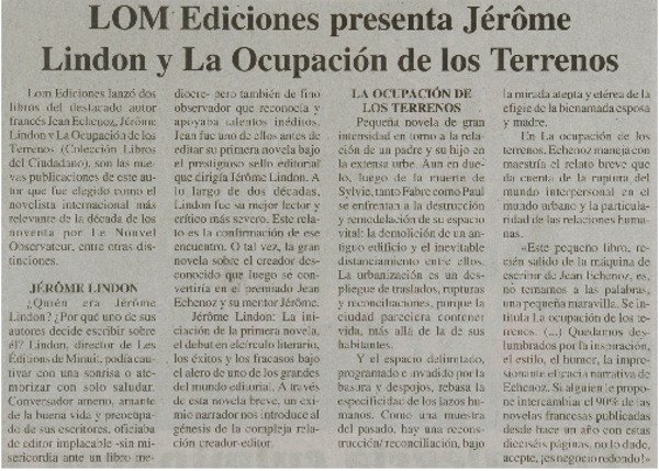 LOM Ediciones presenta Jérôme Lindon y La Ocupación de los terrenos [artículo]