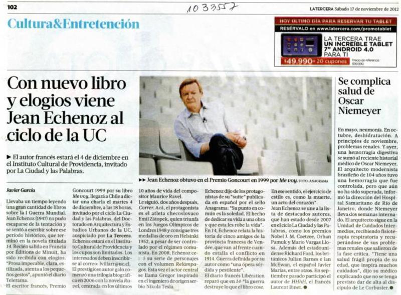 Con nuevo libro y elogios viene Jean Echenoz al ciclo de la UC [artículo]Javier García