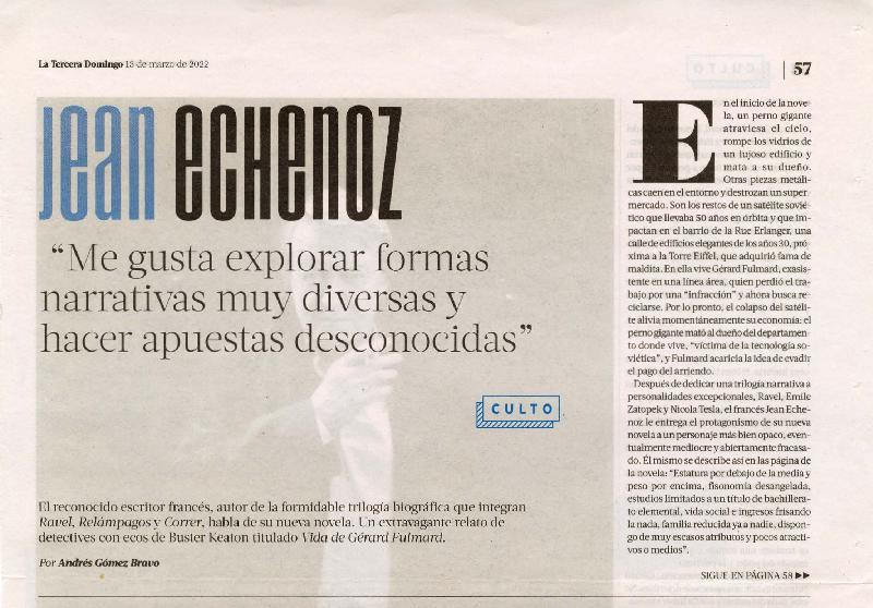 Jean echenoz "Me gusta explorar formas narrativas muy diversas y hacer apuestas desconocidas" [artículo] Por Andres Gómez Bravo.