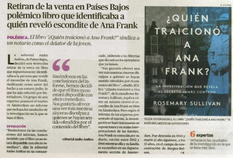 Retiran de la venta en Países Bajos polémico libro que identificaba a quién reveló escondite de Ana Frank [artículo].