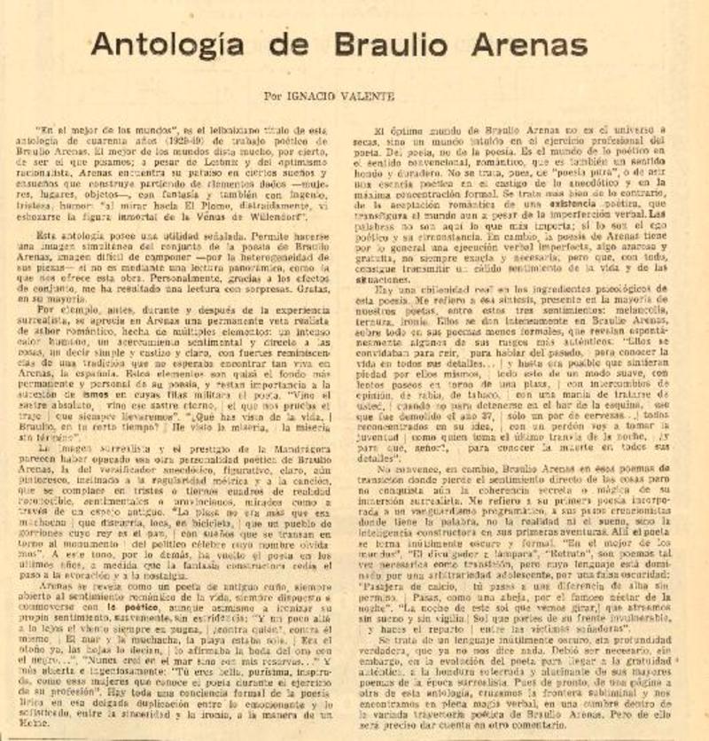 Antología de Braulio Arenas [artículo] Ignacio Valente.