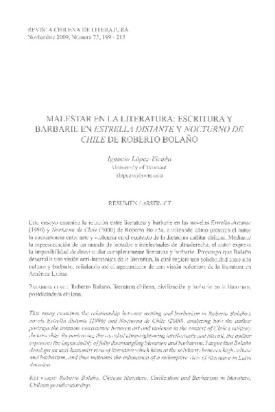 Malestar en la literatura: Escritura y barbarie en Estrella Distante y Nocturno de Chile de Roberto Bolaño [artículo] Ignacio López-Vicuña.