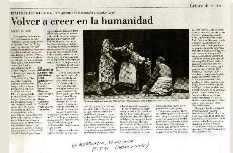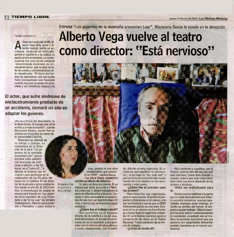 Alberto Vega prepara un nuevo montaje teatral y se reencuentra con la universidad [artículo] Eduardo Miranda.