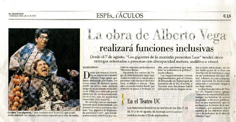 La obra de Alberto Vega realizará funciones exclusivas [artículo] Eduardo Miranda