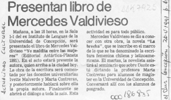 Hoy presentan novela de Mercedes Valdivieso [artículo].