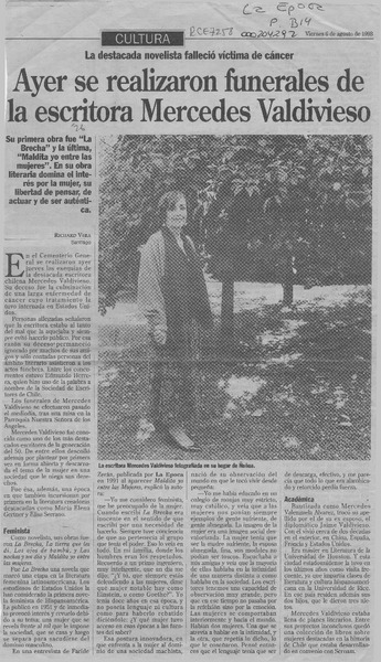Ayer se realizaron funerales de la escritora Mercedes Valdivieso [artículo] Richard Vera.