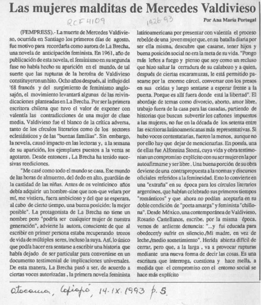 Mujeres malditas de Mercedes Valdivieso [artículo] Ana María Portugal.