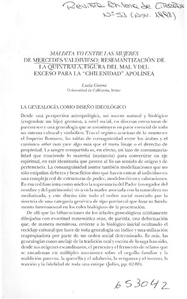 Maldita yo entre las mujeres de Mercedes Valdivieso, resemantización de La Quintrala, figura del mal y del exceso para la "chilenidad" apolínea [artículo] Lucía Guerra