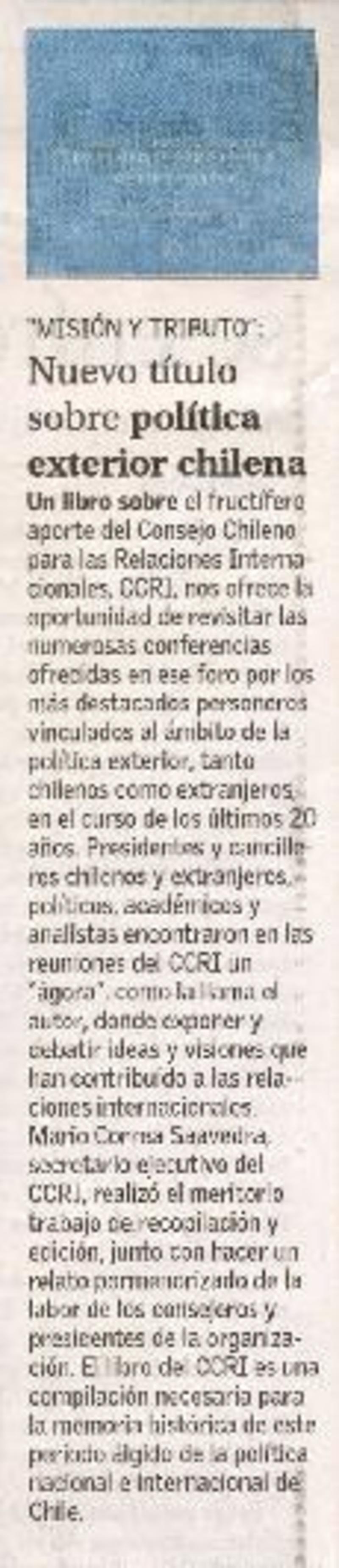 Misión y tributo" Nuevo título sobre política chilena [artículo].