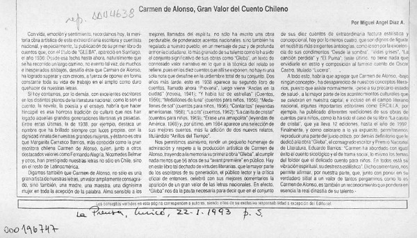 Carmen de Alonso, gran valor del cuento chileno [artículo] Miguel Angel Díaz A.