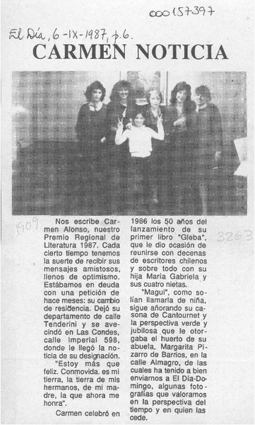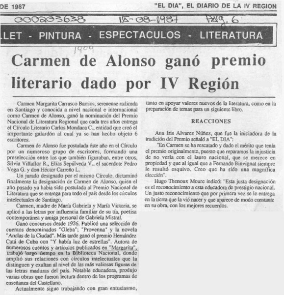 Carmen de Alonso recibe premio regional de literatura [artículo].