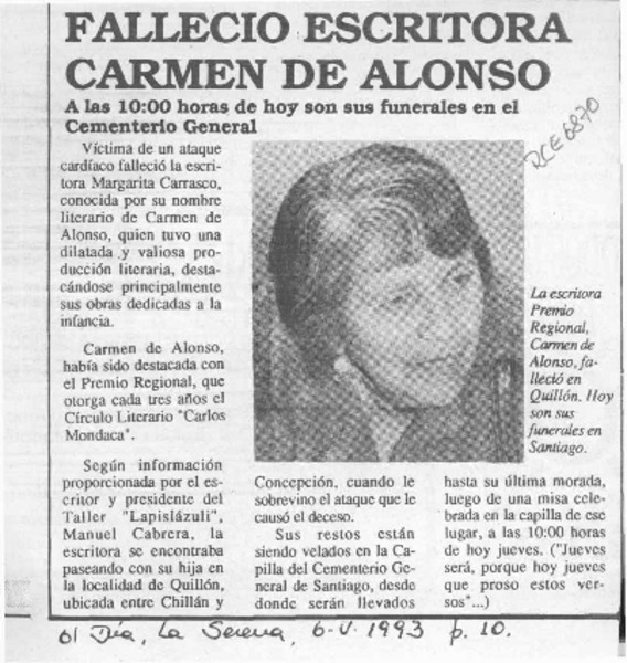 Carmen de Alonso ganó premio literario dado por IV Región [artículo].