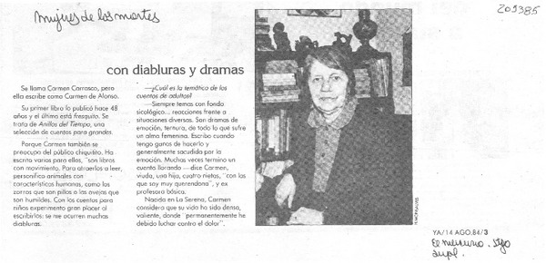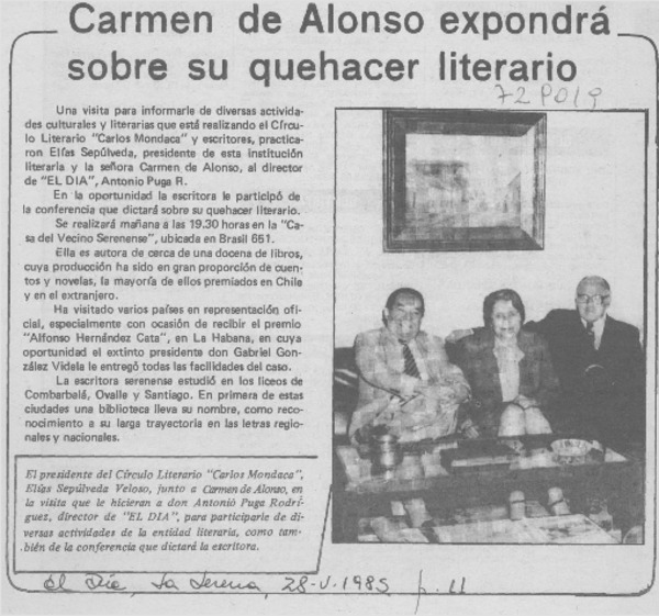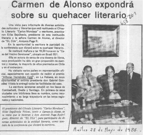 Carmen de Alonso expondrá sobre su quehacer literario. [artículo]