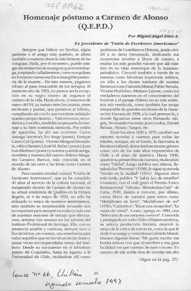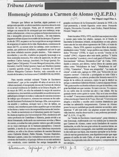 Homenaje póstumo a Carmen de Alonso [artículo] Miguel Angel Díaz A.