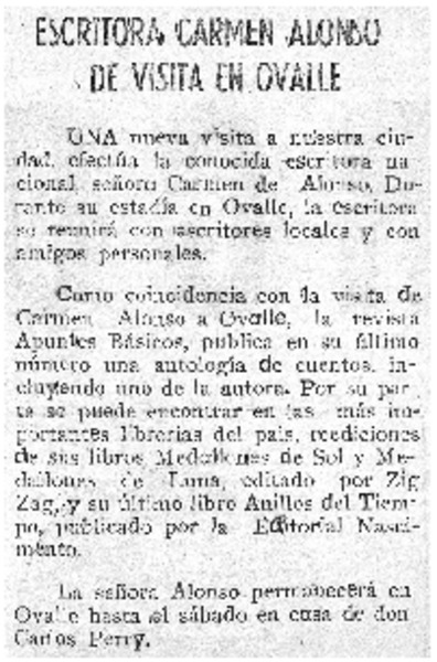 Escritora, Carmen Alonso de visita en Ovalle. [artículo]