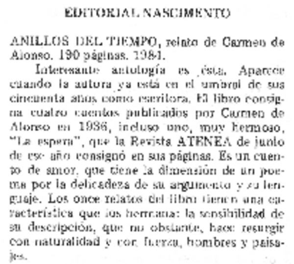 Carmen de Alonso y sus "Anillos del tiempo" [artículo] Ruth Eliana Merino.
