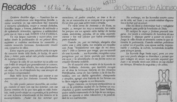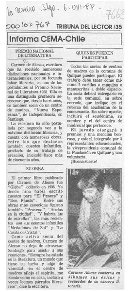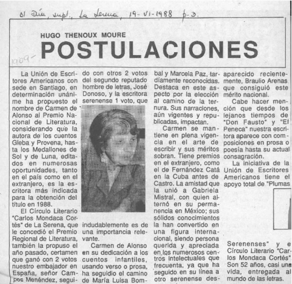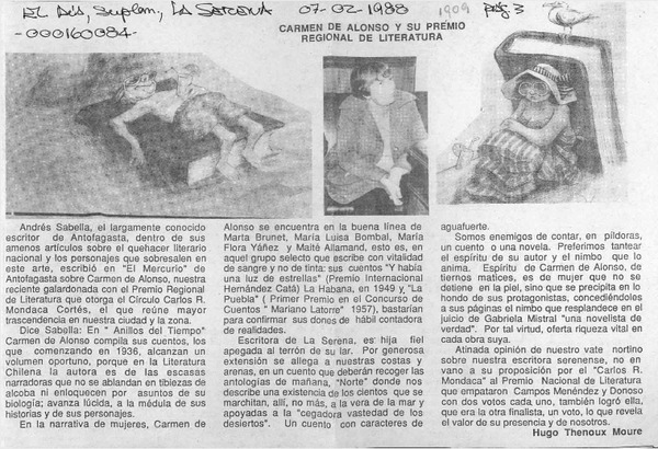 Carmen de Alonso premio nacional de literatura "Carlos R. Mondaca Cortés" [artículo] Hugo Thénoux Moure.