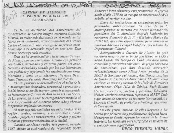 Carmen de Alonso y el premio regional de literatura [artículo] Hugo Thénoux Moure.