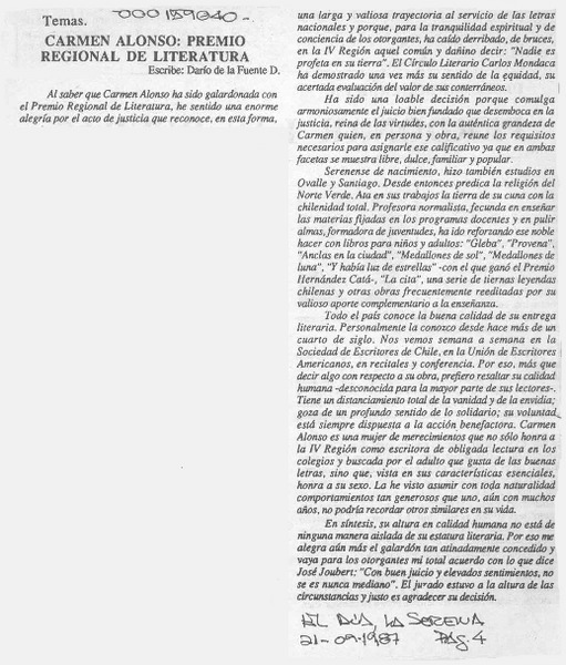 Carmen Alonso, Premio Regional de Literatura [artículo] Darío de la Fuente.