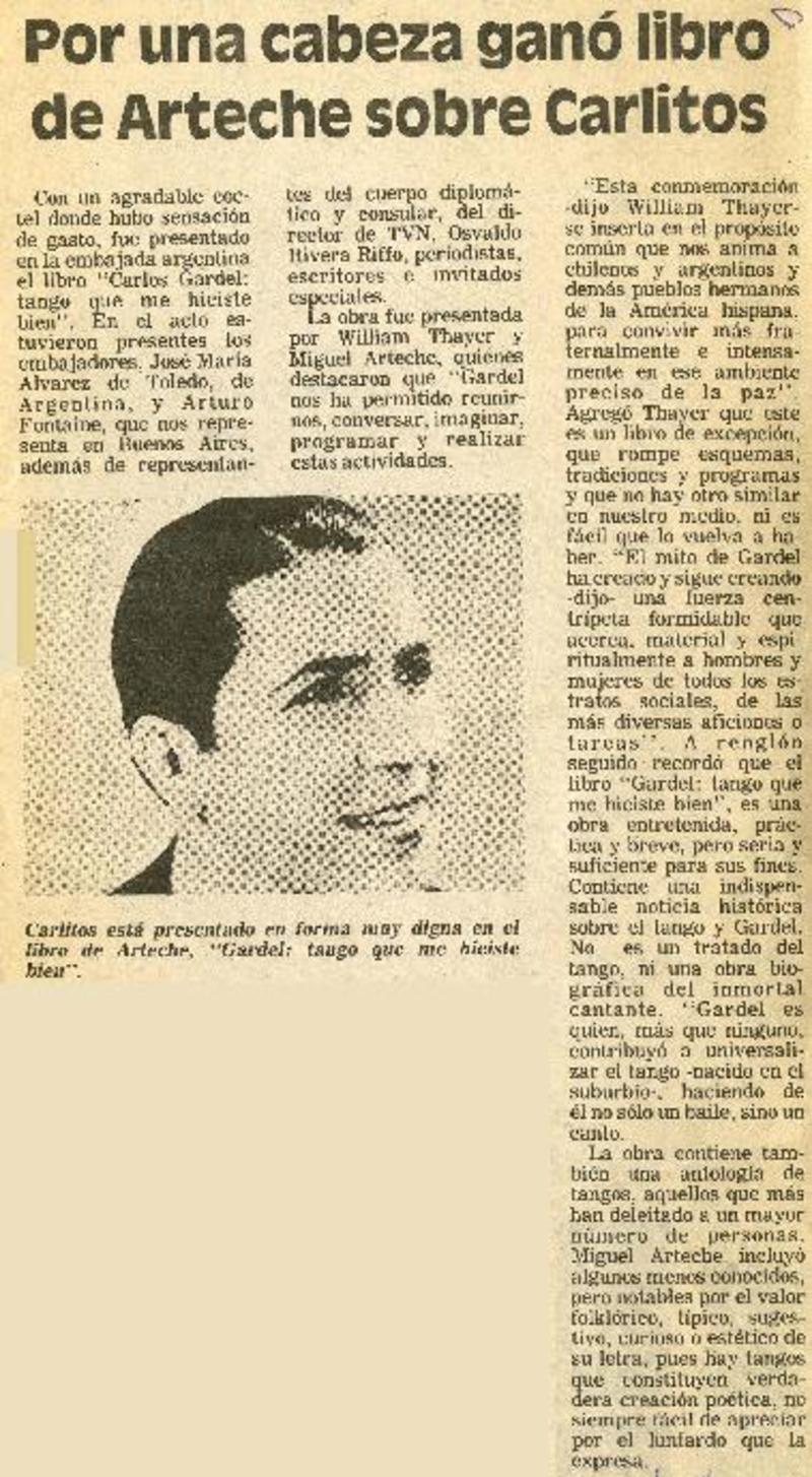 Por una cabeza ganó libro de Arteche sobre Carlitos [artículo].