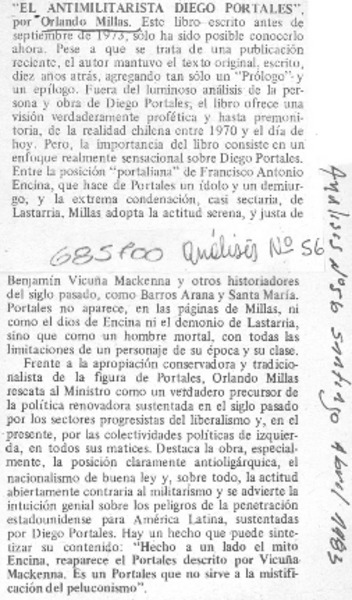 Millas, Orlando - Autores chilenos - Antimilitarista Diego Portales