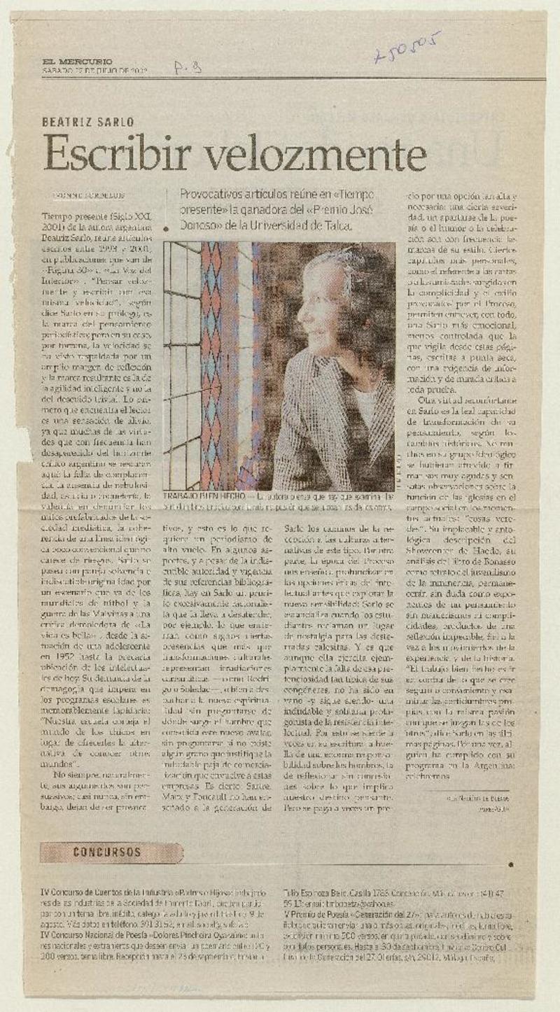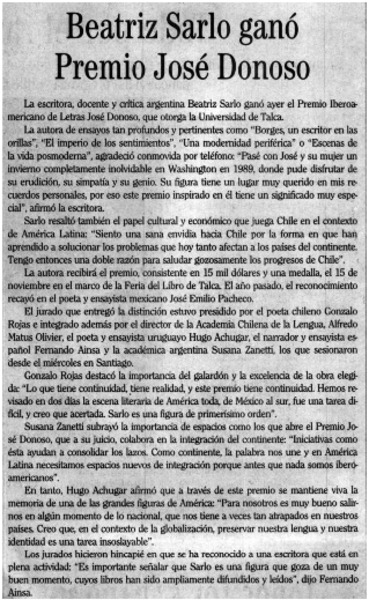 Escritora argentina Beatriz Sarlo ganó Premio Iberoamericano de Letras José Donoso 2002. [artículo]