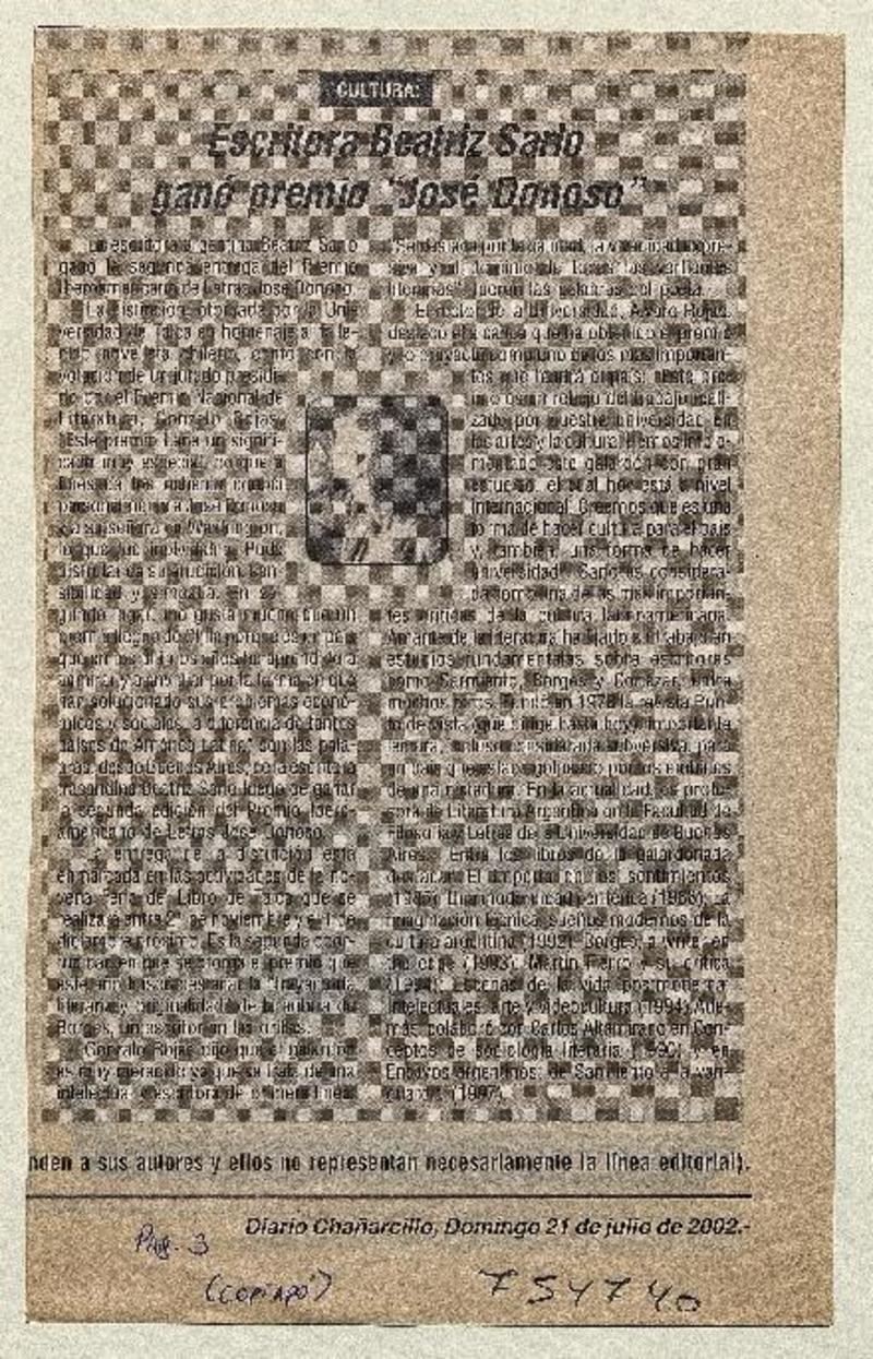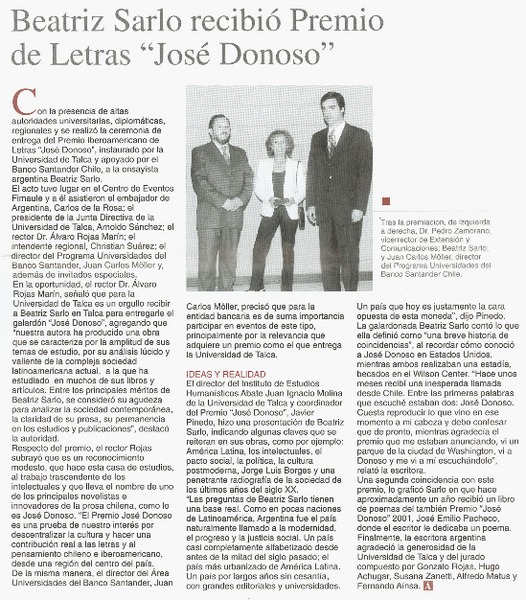 Escritora Beatriz Sarlo ganó premio "José Donoso" "José Donoso" [artículo] :